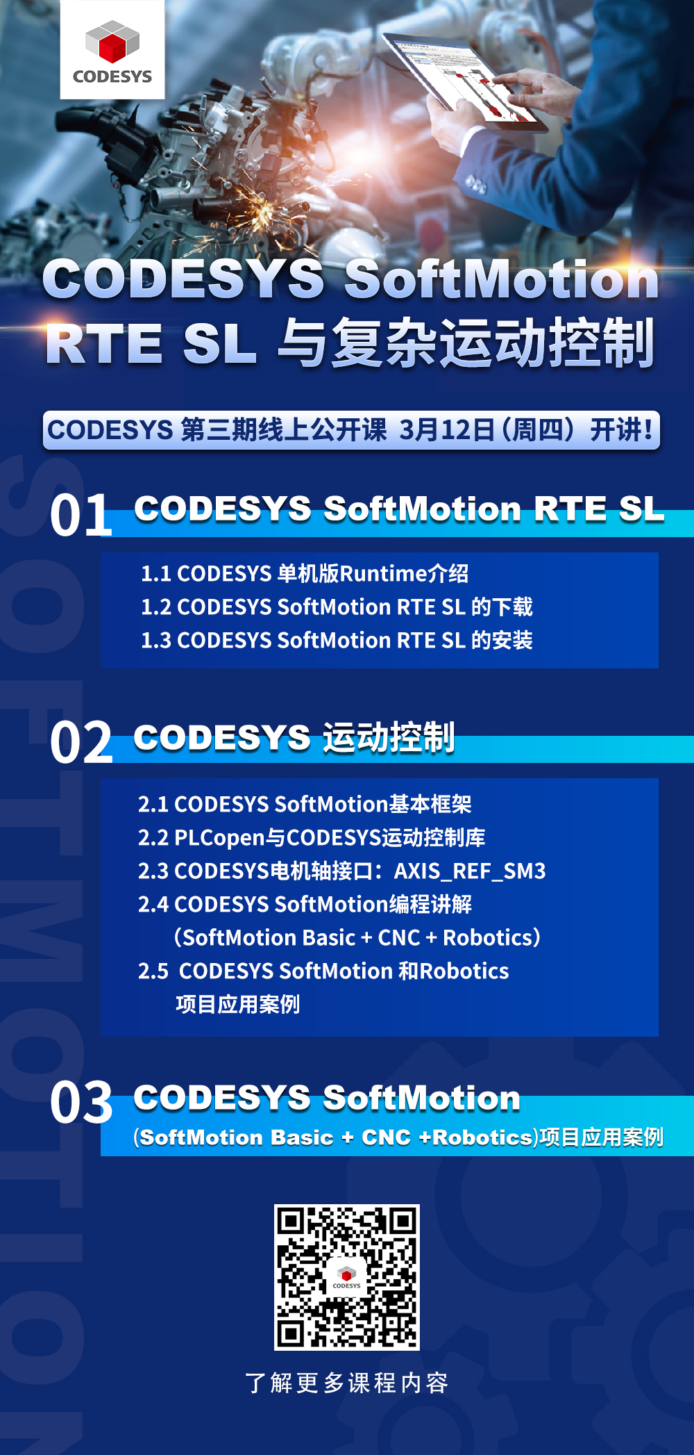 CODESYS,2020年第三次線上公開(kāi)課將于3月12日 20:00 播出。課長(zhǎng)1.5小時(shí)。本次課程主題為《CODESYS SoftMotion RTE SL與復(fù)雜運(yùn)動(dòng)控制》。