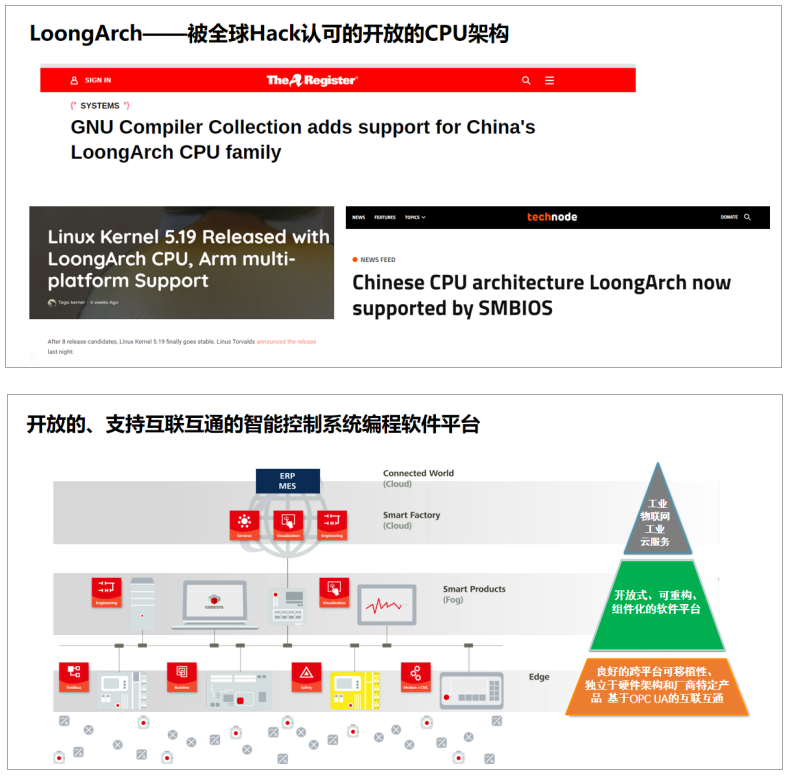 CODESYS 大中華區(qū)總裁馬立新先生在本次活動主論壇為大家分享《基于龍芯LoongArch 架構(gòu)和 CODESYS 自動化軟件平臺的智能控制系統(tǒng)》主題報告。馬總在報告中指出:智能制造時代下,傳統(tǒng)控制需要向融合 AI 人工智能技術(shù)的智能控制轉(zhuǎn)變,智能控制可以解決那些用傳統(tǒng)控制方法難以解決的復雜系統(tǒng)的控制問題。而一個智能控制系統(tǒng)需要有高算力的硬件做支撐,以及具有自適應性的軟件做支持。龍芯推出了龍芯指令系統(tǒng)(LoongArch®),龍芯指令系統(tǒng)具有較好的自主性、先進性與兼容性。它從整個架構(gòu)的頂層規(guī)劃,到各部分的功能定義,再到細節(jié)上每條指令的編碼、名稱、含義,在架構(gòu)上進行自主重新設計,具有充分的自主性。龍芯指令系統(tǒng)摒棄了傳統(tǒng)指令系統(tǒng)中部分不適應當前軟硬件設計技術(shù)發(fā)展趨勢的陳舊內(nèi)容,吸納了近年來指令系統(tǒng)設計領(lǐng)域諸多先進的技術(shù)發(fā)展成果。同原有兼容指令系統(tǒng)相比,不僅在硬件方面更易于高性能低功耗設計,而且在軟件方面更易于編譯優(yōu)化和操作系統(tǒng)、虛擬機的開發(fā)。LoongArch 成為被全球Hack認可的開放的 CPU 架構(gòu)。