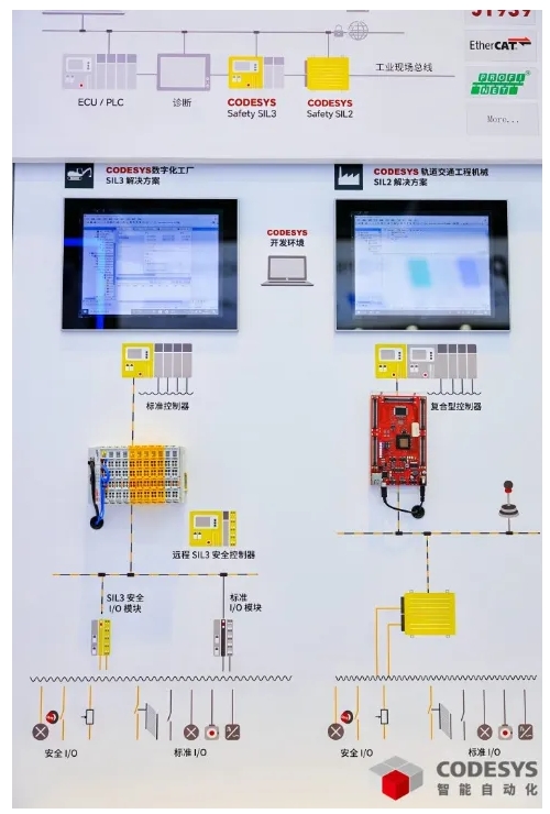 CODESYS Safety SIL 3(功能安全控制) 可用于工廠自動化領(lǐng)域,支持用戶開發(fā)符合 SIL 3 國際標(biāo)準(zhǔn)的安全控制器;CODESYS Safety SIL 2 (功能安全控制)則用于開發(fā)符合 IEC 61508 和 EN 13849 PLd 標(biāo)準(zhǔn)的安全控制器,應(yīng)用于工程機(jī)械和特種車輛等領(lǐng)域。同時 CODESYS 支持用戶使用 CODESYS EtherCAT 功能安全模塊開發(fā)實(shí)現(xiàn)功能安全目標(biāo)的 Safety 安全控制系統(tǒng)。